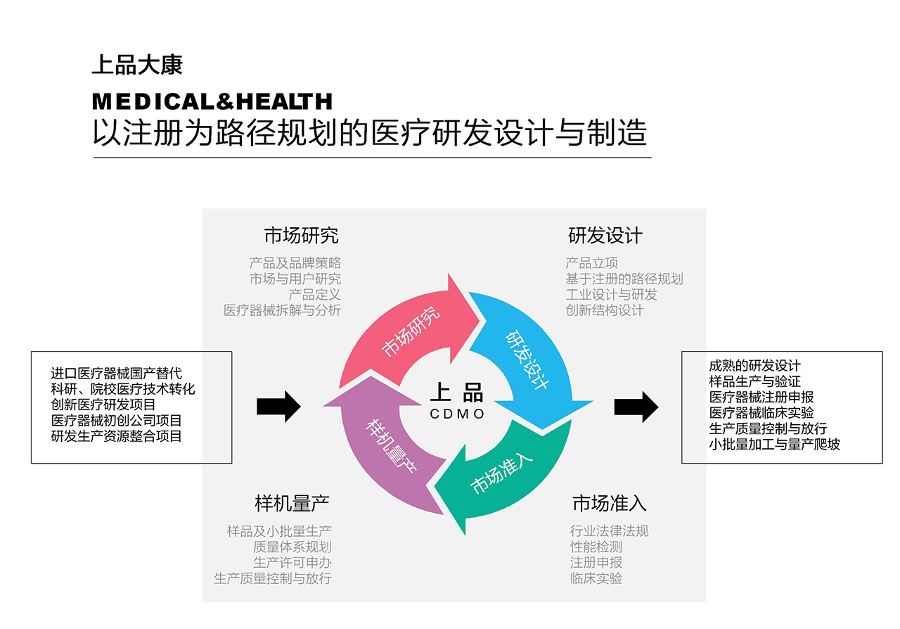 上品醫(yī)療器械CDMO平臺(tái):致力于為進(jìn)口醫(yī)療器械國(guó)產(chǎn)替代項(xiàng)目,科研、院校醫(yī)療技術(shù)轉(zhuǎn)化項(xiàng)目,創(chuàng)新醫(yī)療研發(fā)項(xiàng)目,醫(yī)療器械初創(chuàng)公司項(xiàng)目,研發(fā)生產(chǎn)資源整合項(xiàng)目提供法規(guī)咨詢、技術(shù)轉(zhuǎn)化、品牌規(guī)劃、設(shè)計(jì)研發(fā)、樣品生產(chǎn)、檢測(cè)驗(yàn)證、臨床試驗(yàn)、質(zhì)量體系及注冊(cè)申報(bào)、中小批量生產(chǎn)等全產(chǎn)業(yè)鏈技術(shù)服務(wù)。以注冊(cè)為路徑規(guī)劃的研發(fā)設(shè)計(jì)幫助醫(yī)療器械企業(yè)減少研發(fā)生產(chǎn)運(yùn)營(yíng)成本、縮短產(chǎn)品上市周期、提升項(xiàng)目轉(zhuǎn)化成功率、提高產(chǎn)品注冊(cè)通過(guò)率。2018年在中關(guān)村醫(yī)學(xué)工程轉(zhuǎn)化中心投資成立加工廠,能夠高效可控推進(jìn)醫(yī)療器械的研發(fā)迭代及產(chǎn)業(yè)化。