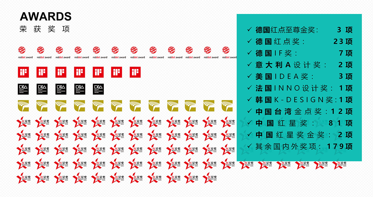 - 獲得德國(guó)IF獎(jiǎng)3項(xiàng);德國(guó)紅點(diǎn)獎(jiǎng)2項(xiàng);中國(guó)好設(shè)計(jì)1項(xiàng);省長(zhǎng)杯3項(xiàng);