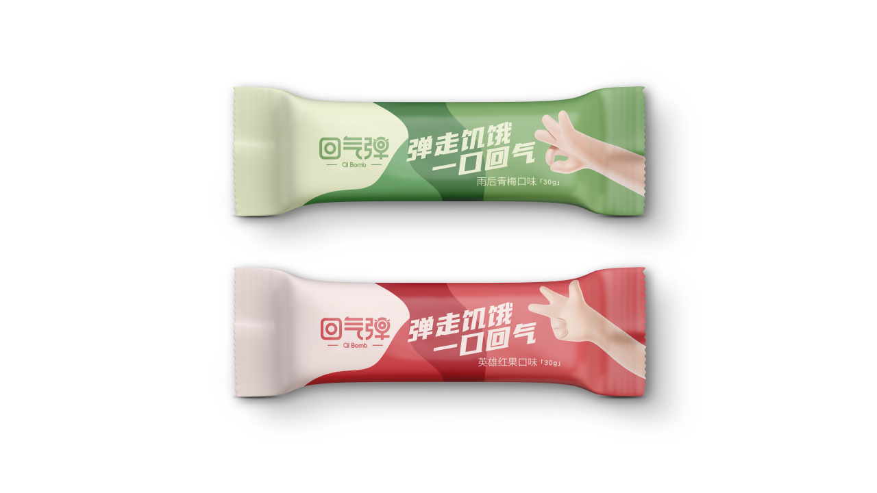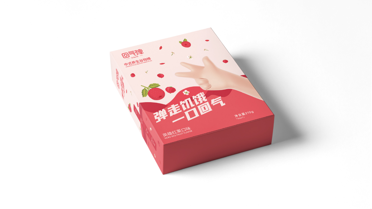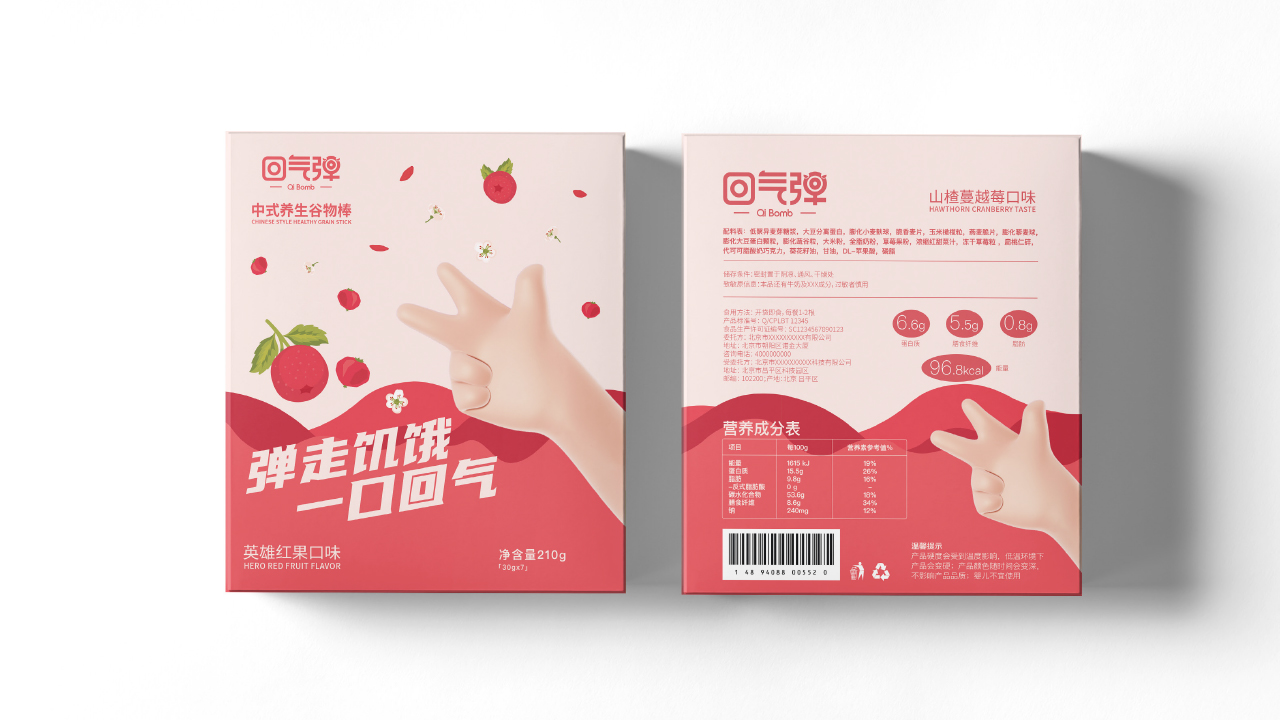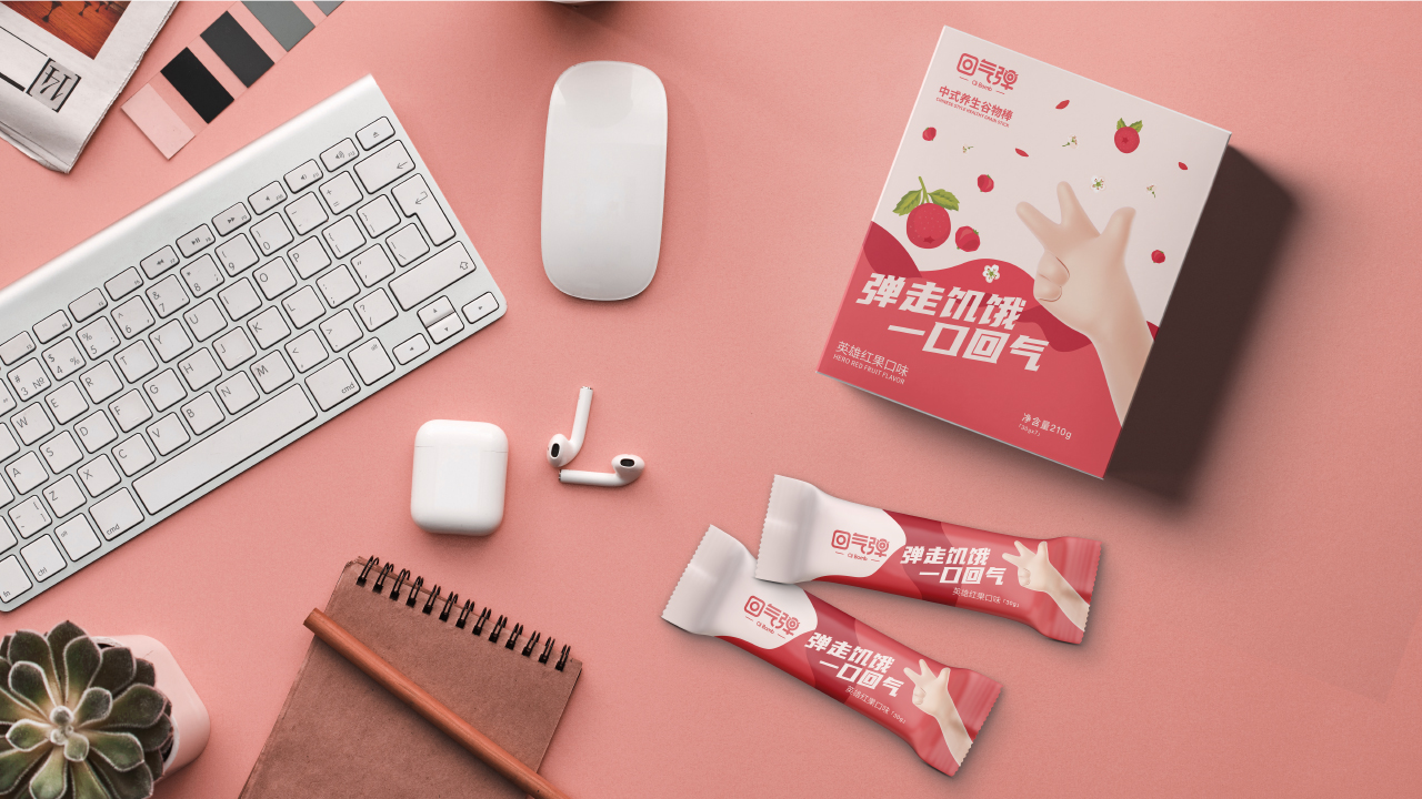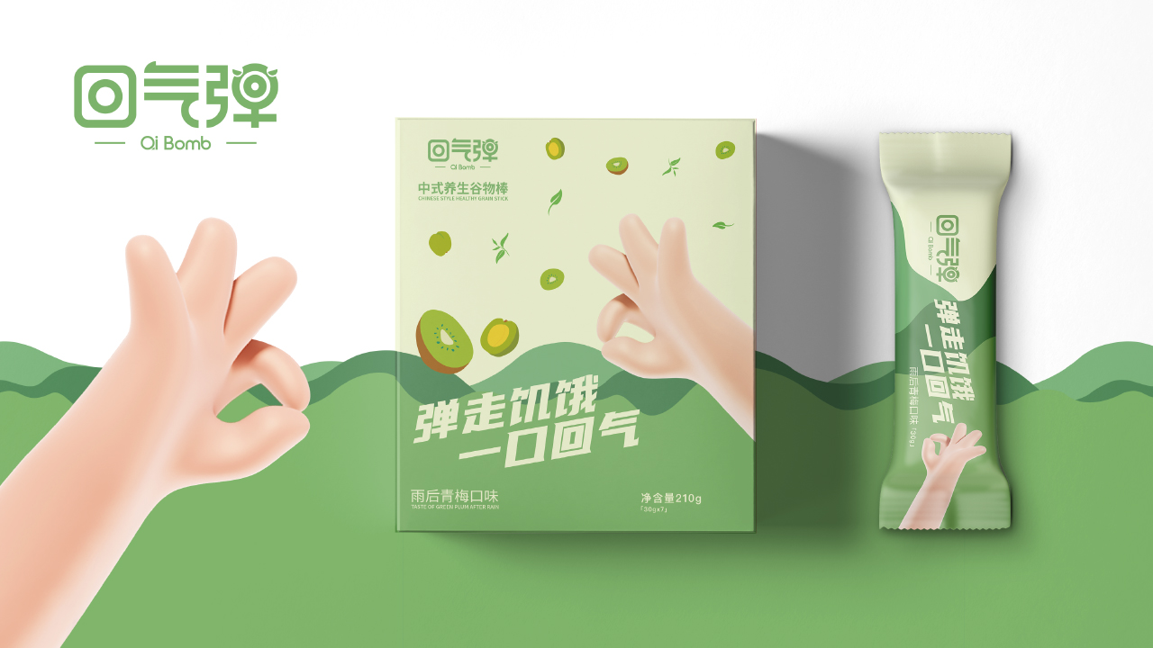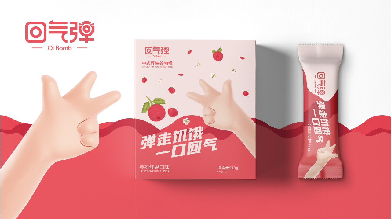 在全民養生的時代背景下,谷物棒成為許多有健身、減肥需求人士的心頭好,消費階層相對年輕,影響消費決策的原因也更加細分。因此,品牌logo需要更多去圍繞視覺記憶的打造來設計。 回氣彈,引用“回氣丹”的概念,面對那些心中還懷揣夢想,對生活有激情的年輕人。無論在產品還是品牌層面,它都倡導能量與活力的健康生活,基于此,上品方為產品做了如下設計——