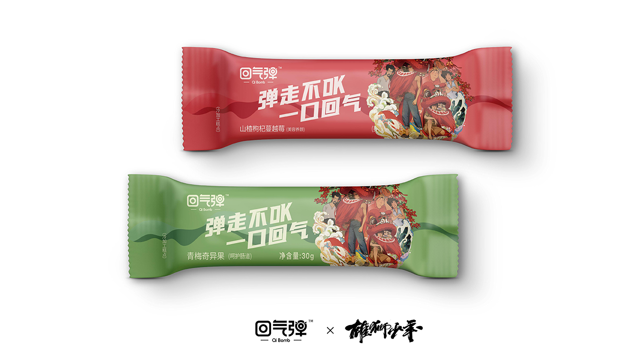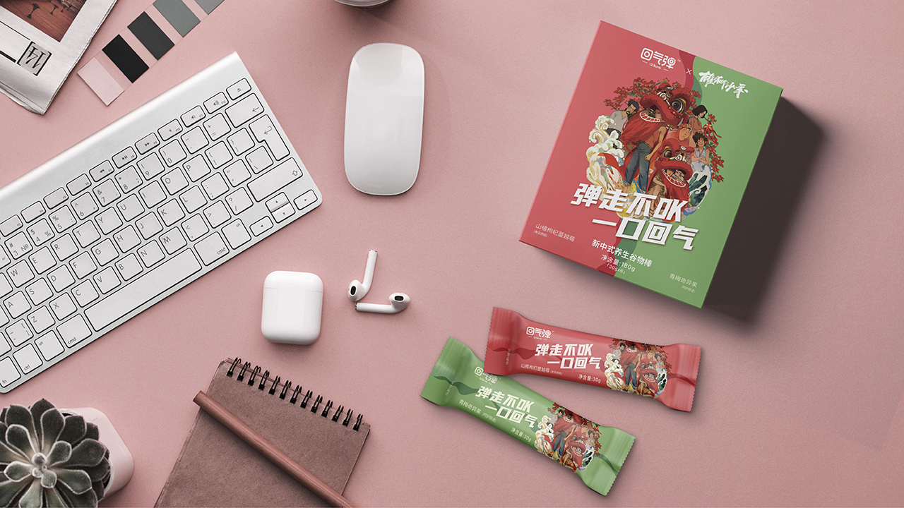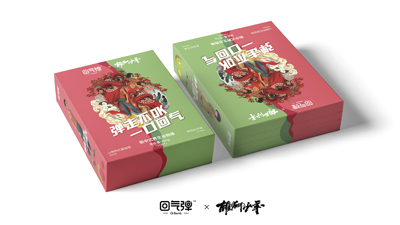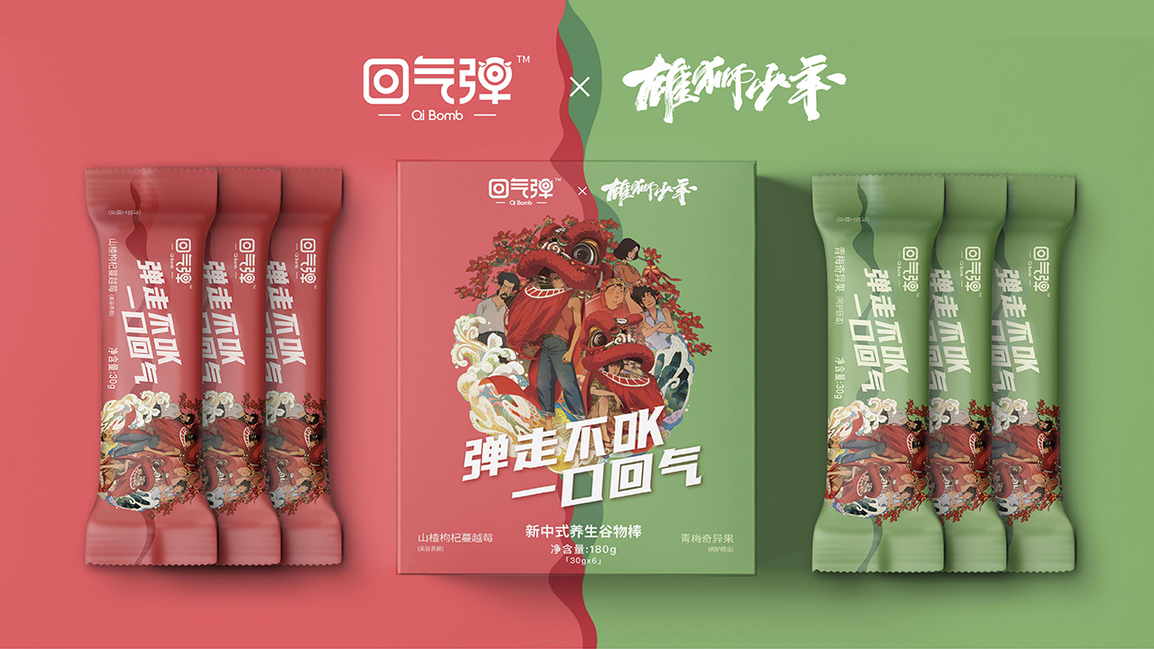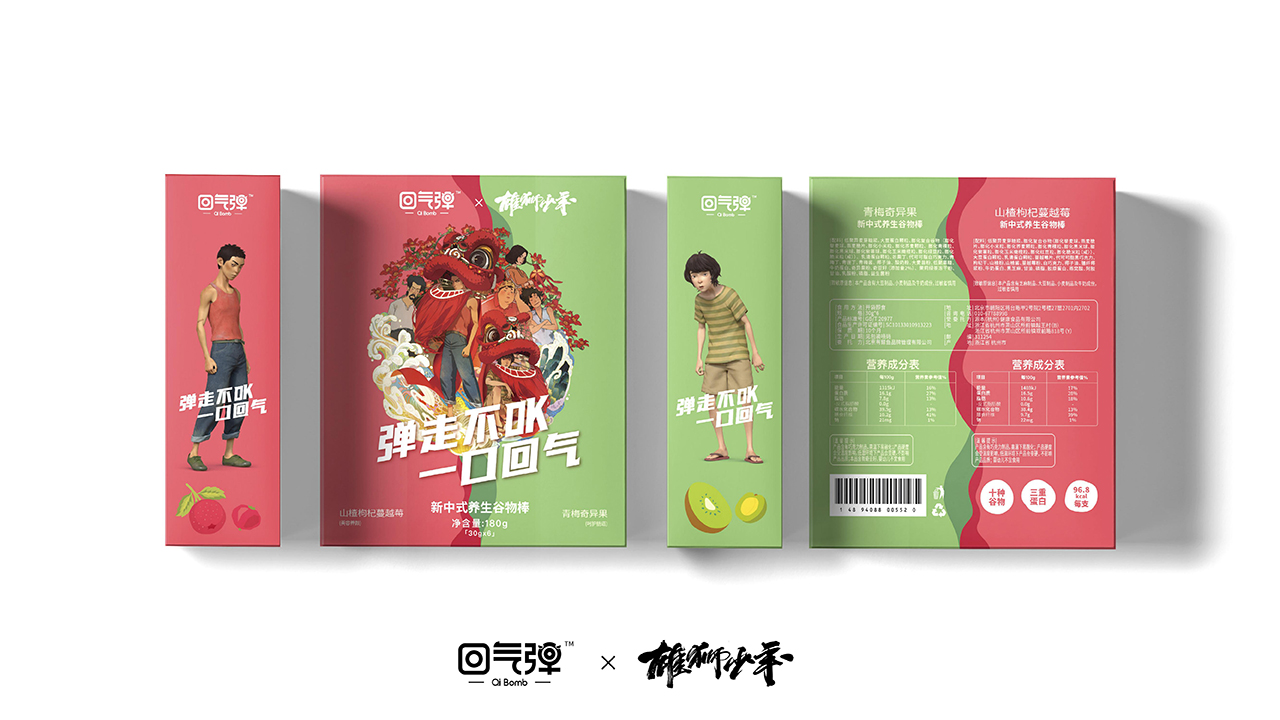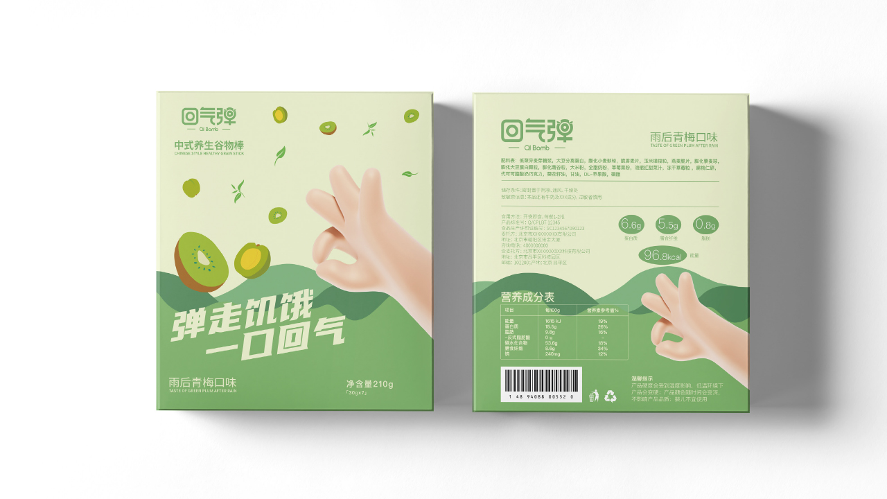 在全民養生的時代背景下,谷物棒成為許多有健身、減肥需求人士的心頭好,消費階層相對年輕,影響消費決策的原因也更加細分。因此,品牌logo需要更多去圍繞視覺記憶的打造來設計。 回氣彈,引用“回氣丹”的概念,面對那些心中還懷揣夢想,對生活有激情的年輕人。無論在產品還是品牌層面,它都倡導能量與活力的健康生活,基于此,上品方為產品做了如下設計——